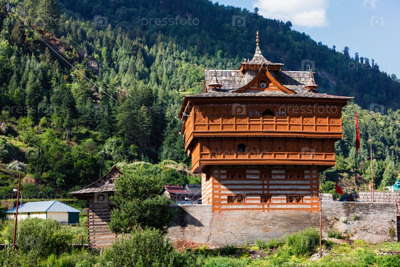 Храм Бхимакали посвящен матери-богине Бхимакали, Сараан, Киннауру, Химачал-Прадеш, Индия.Традиционная архитектура Гимачал-Прадеша - слои леса чередуются с разбитыми камнями