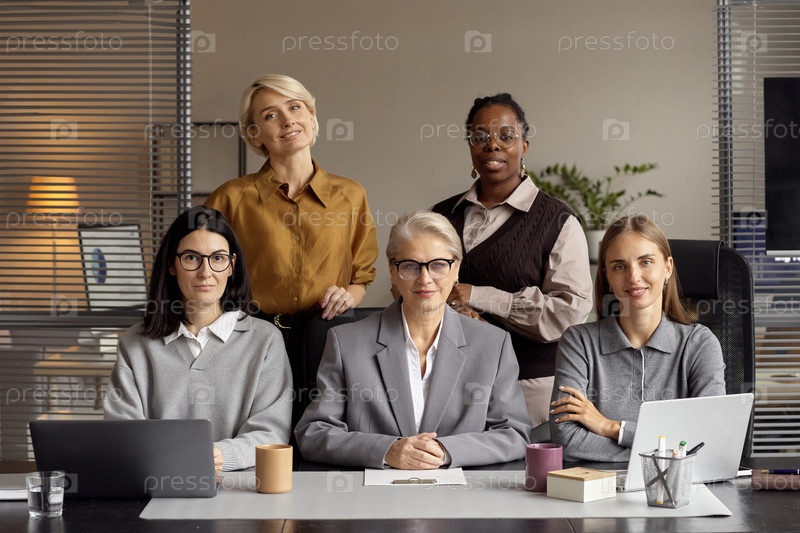 Разнообразная группа женщин среднего возраста и молодых взрослых, позирующих в офисе