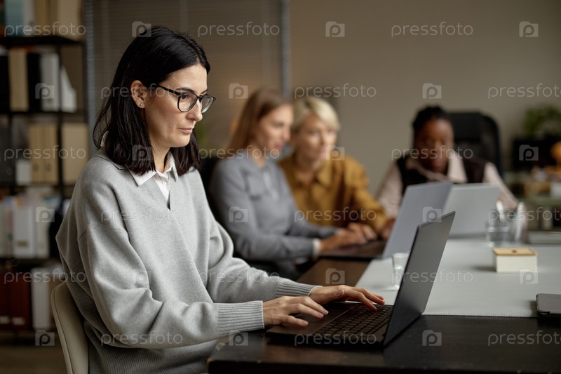 Взрослая женщина работает на ноутбуке с различными коллегами, сотрудничающими