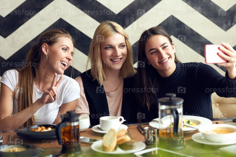 Различные друзья делают селфи в кафе