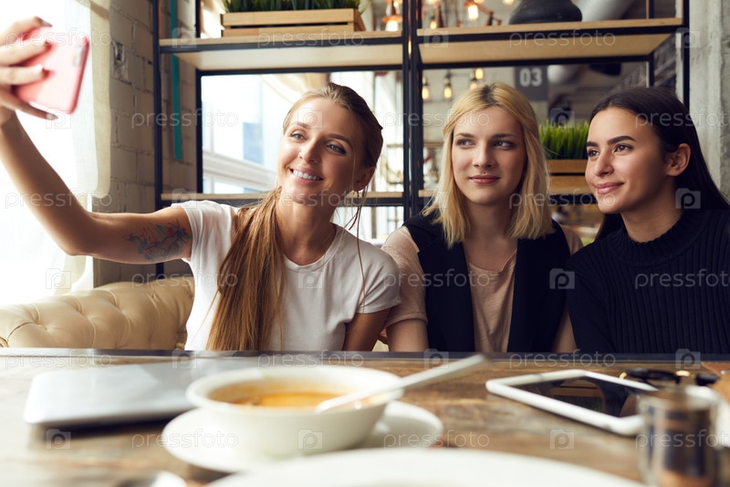 Трансгендеры и их подруги делают селфи в кафе