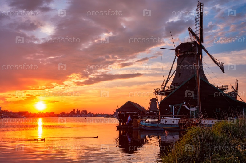 Голландская сельская сцена - это ветряные мельницы на знаменитом туристическом объекте Заансе-Шанс в Нидерландах при закате солнца с драматическим небом