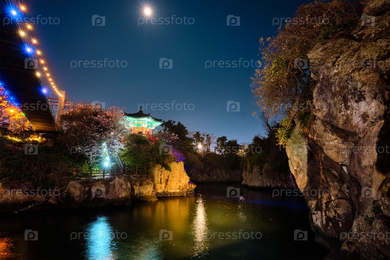 живописный пруд Йонгён с павильоном Юен, освещенным ночью, острова Чеджу, Южная Корея