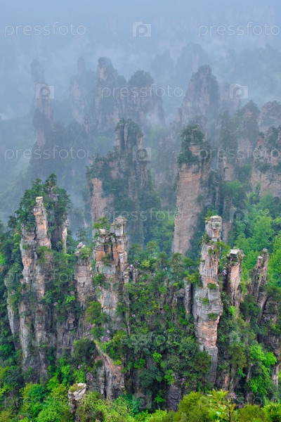 Известная туристическая достопримечательность Китая - каменные столбы скальных гор Чжанцзянджи в туманных облаках во Вулингюане, провинция Хунань, Китай