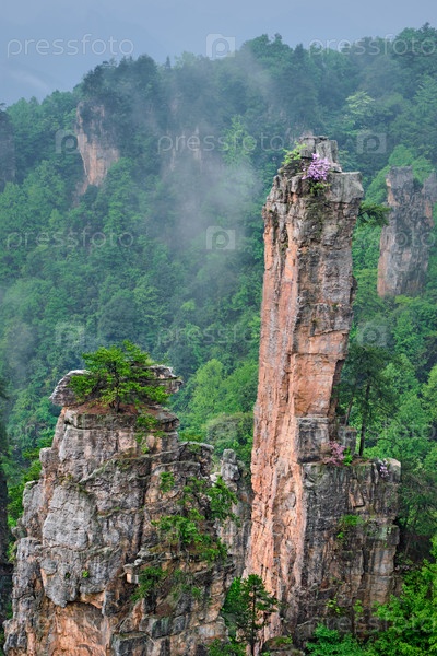 Известная туристическая достопримечательность Китая - каменные столбы скальных гор Чжанцзянджи в туманных облаках во Вулингюане, провинция Хунань, Китай