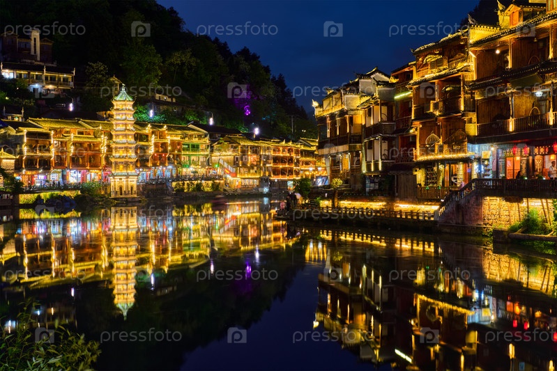 Китайская туристическая достопримечательность - древний город Фэньхуань (Феникс) на реке Тяо Цзян, освещенный ночью