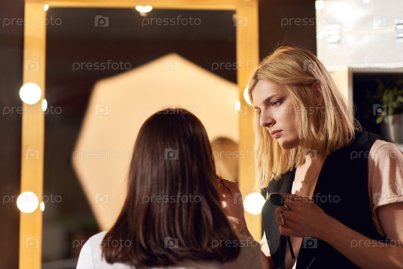 Транссексуальный гримёр наносит макияж на лицо моделей в студии