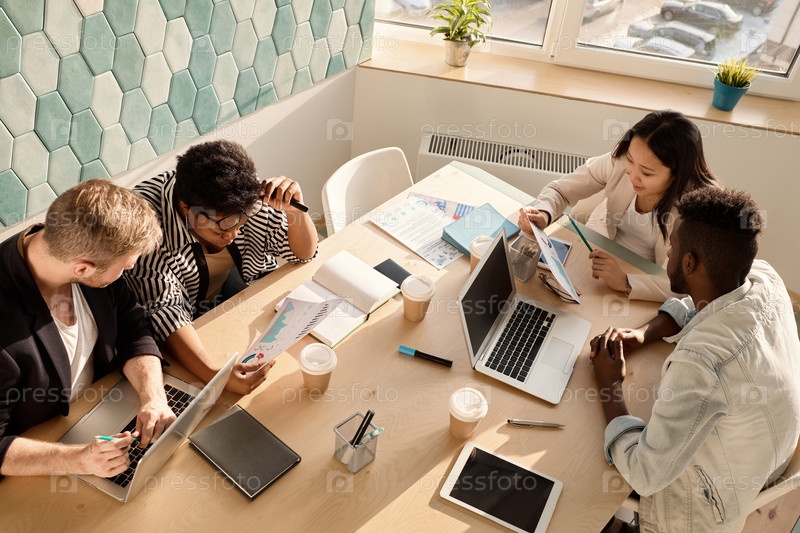 Бизнесмены, обсуждающие встречу за офисным столом