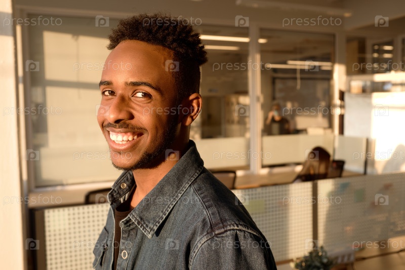 Портрет веселого менеджера на закате солнца в офисе