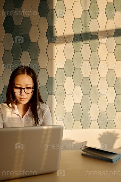 Азиатская женщина-сотрудник работает на ноутбуке в офисе