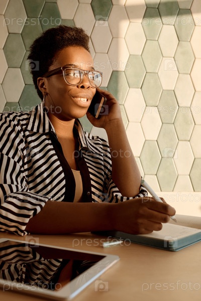 Молодая предпринимательница звонит по смартфону на рабочий стол офиса