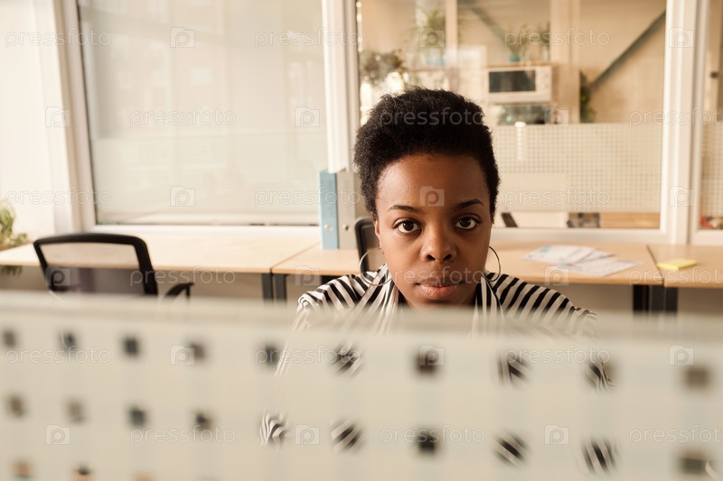 Молодая женщина смотрит на камеру Работает в офисе с разделительными стенами