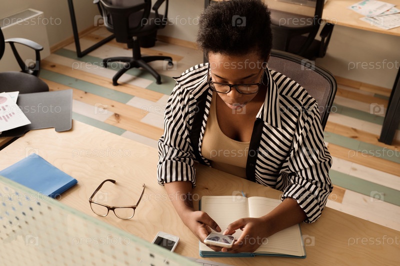 Чёрная женщина-сотрудник отправляет текстовые сообщения на смартфон в офисе