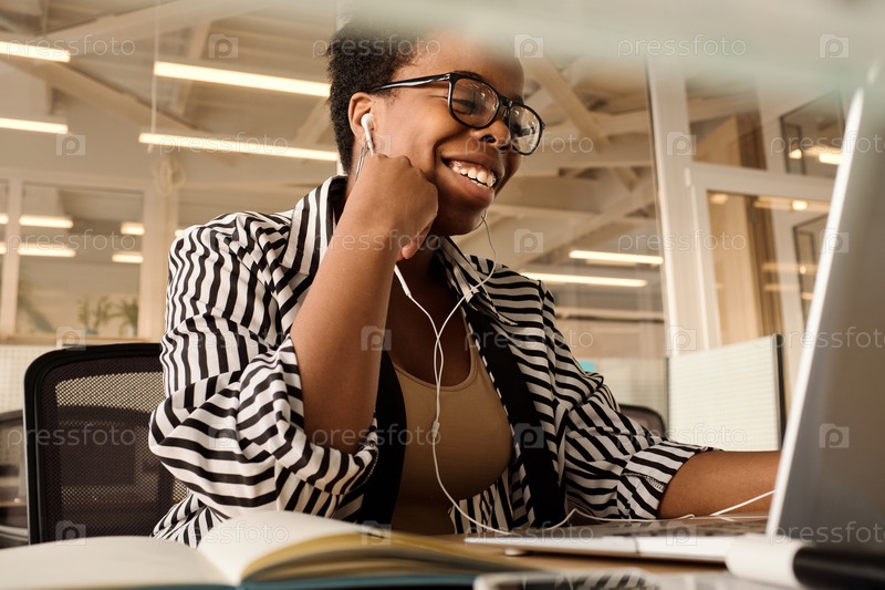 Женщина-сотрудник носит наушники видеочат на ноутбуке