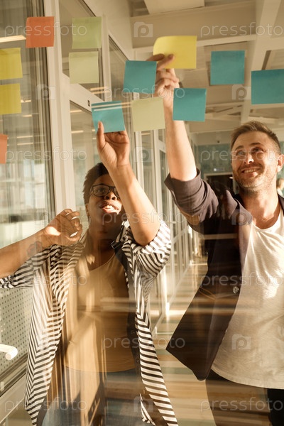 Коллеги улыбаются при мозговом штурме идей