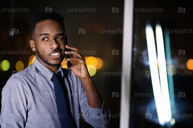 Веселый менеджер звонит по телефону Поздно в офисе
