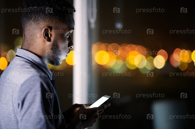 Бизнесмен использует смартфон, работая допоздна в офисе