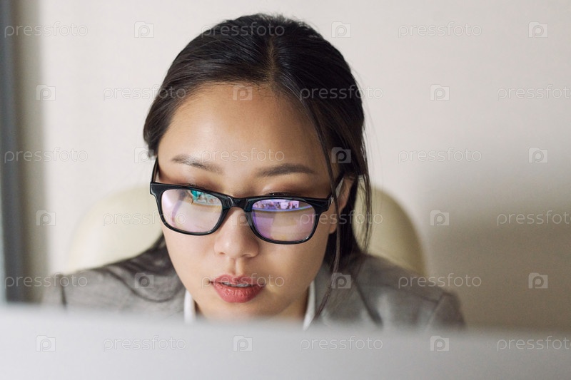 Молодая бизнесвумен в очках смотрит на компьютерный экран