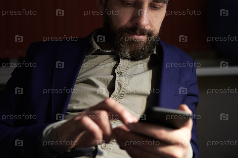 Предприниматель использует смартфон во время отдыха в офисе