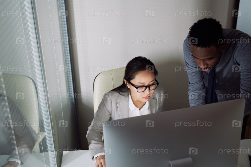 Мужчина-сотрудник помогает коллеге по работе с компьютером