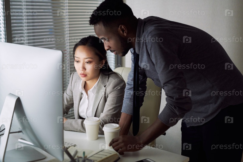 Различные коллеги работают на компьютере в офисе