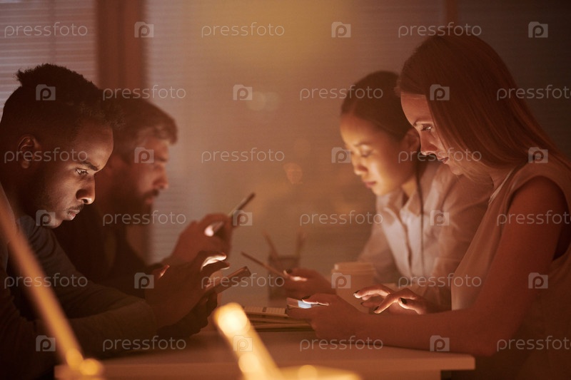 Группа менеджеров, использующих гаджеты во время перерыва на работе