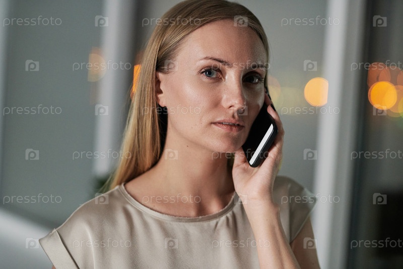 Элегантная деловая женщина разговаривает по телефону и смотрит на камеру