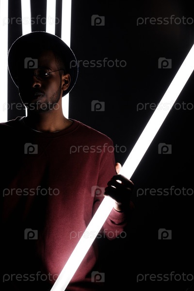 Портрет чернокожего человека, держащего трубную лампу в студии