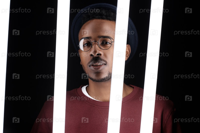 Портрет молодого чернокожего человека за люминесцентными лампами