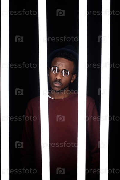 Черный мужчина позирует в студии за трубными лампами