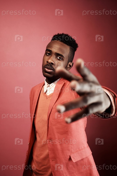 Модный портрет молодого чернокожего мужчины в розовом костюме с вытянутой рукой