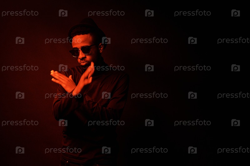 Концептуальный портрет чернокожего человека с перекрещенными руками в темной студии