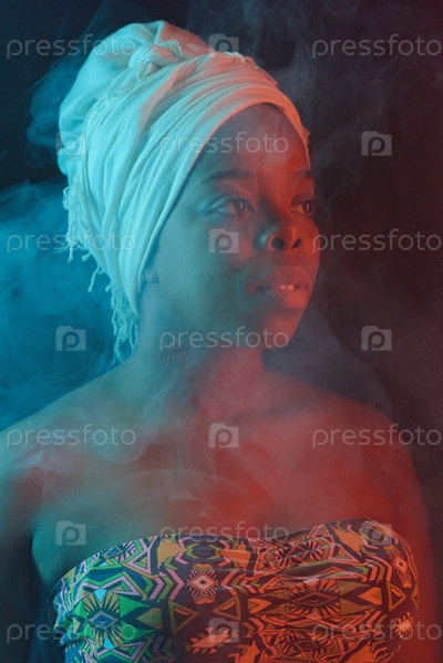 Портрет чернокожей женщины в головном уборе среди дыма