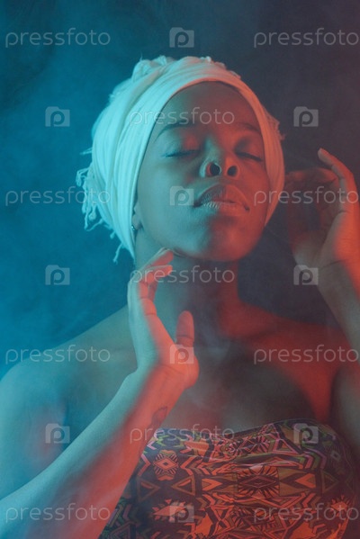 Портрет молодой чернокожей женщины в тюрбане с закрытыми глазами