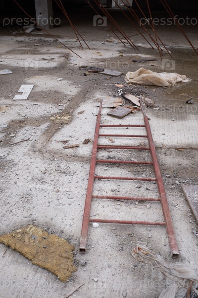 Металлическая лестница, лежащая на земле на стройплощадке во время реконструкции здания