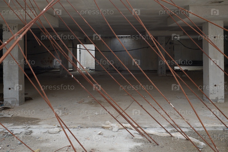 Неоконченная конструкция бетонного здания с открытыми ржавыми арматурными прутьями