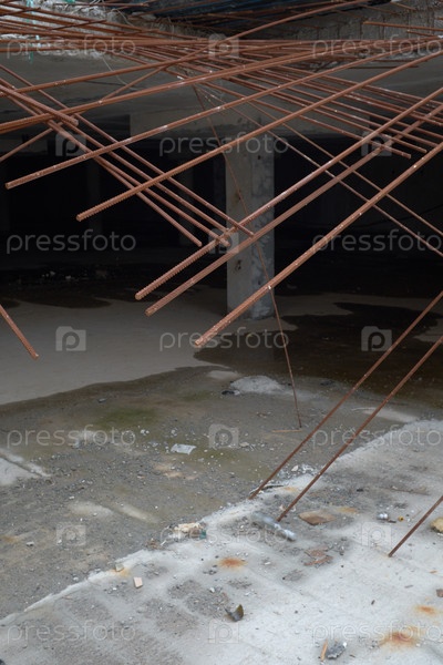 Обнаженные стальные перекладины, выступающие из бетонного пола на строительной площадке