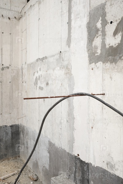 Открытый металлический стержень и изогнутая труба выступают из незавершенной бетонной стены