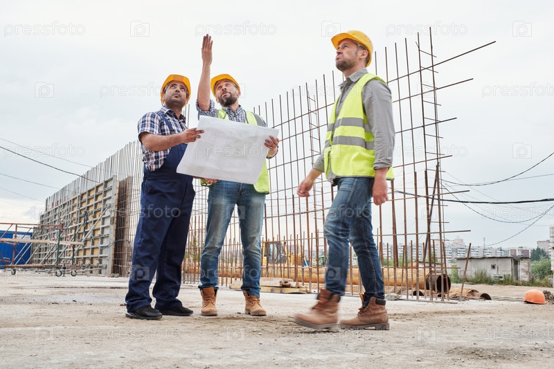 Три строителя обсуждают планы строительства на стройплощадке