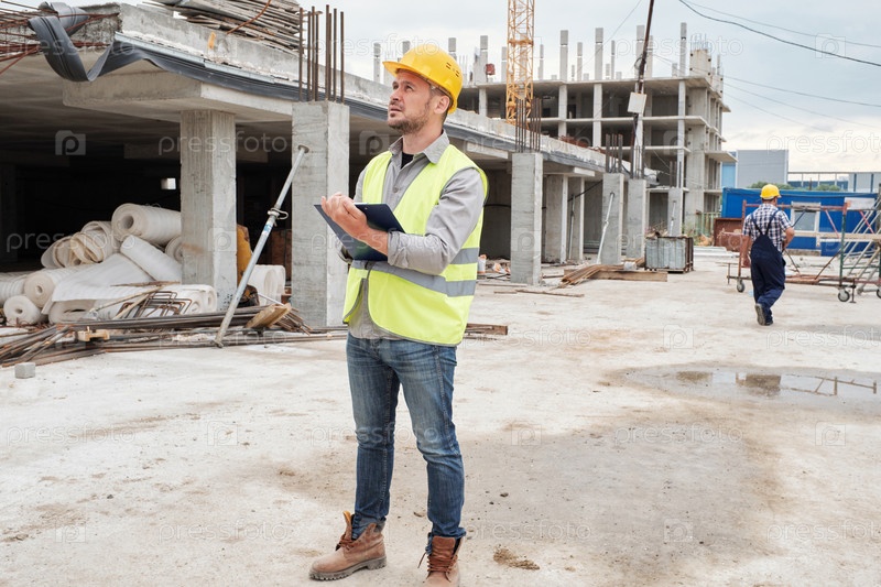 Молодой взрослый человек осматривает стройплощадку с помощью цифрового планшета