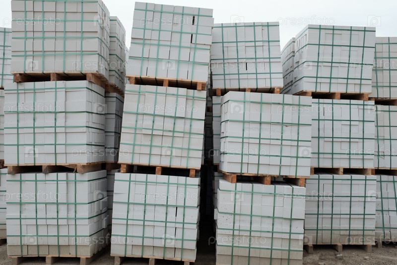 Складываемые бетонные блоки расположены на деревянных поддонах на строительной площадке