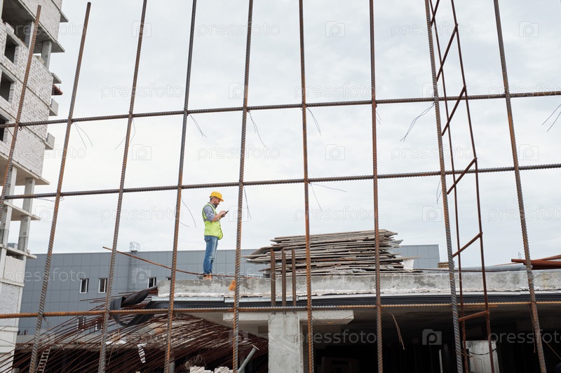 Мужчина средних лет осматривает стройплощадку с помощью цифрового планшета