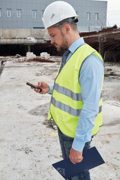 Молодой взрослый мужчина использует смартфон на стройплощадке на открытом воздухе