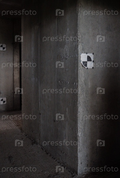 Бетонная стена в незавершенном здании с калибровочными целями для изысканий