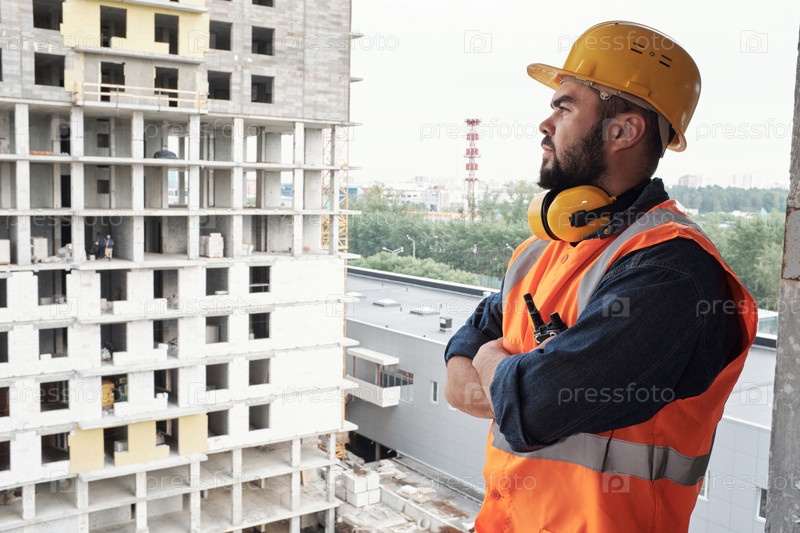 Мужчина контролирует строительную площадку, нося при этом снаряжение безопасности
