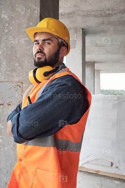 Портрет молодого взрослого мужчины, носящего защитное снаряжение на стройке