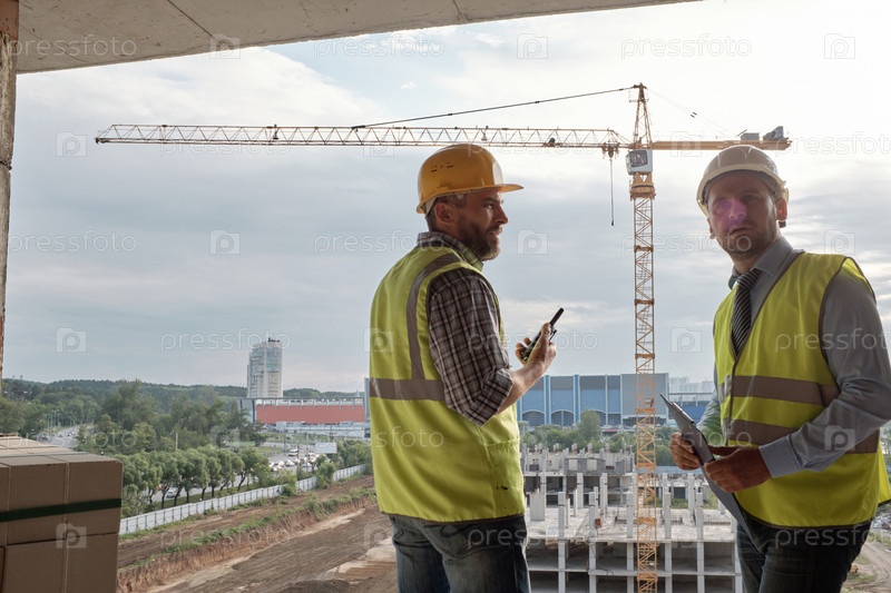 Два мужчины контролируют строительную площадку с краном на заднем плане