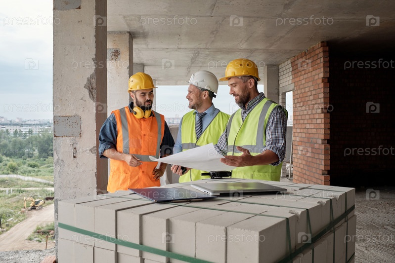 Группа строителей, обсуждающих планы строительства на стройплощадке