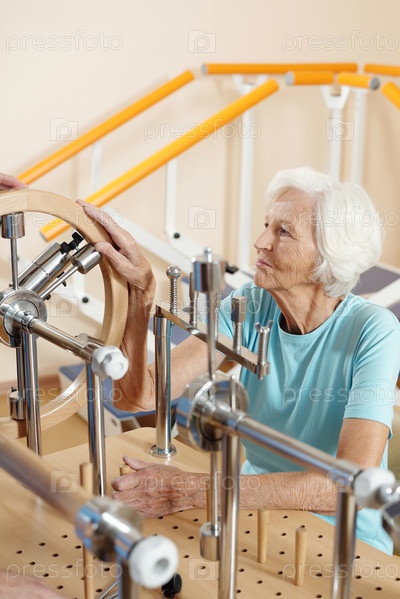 Пожилая женщина делает упражнения на двигательном обучающем оборудовании
