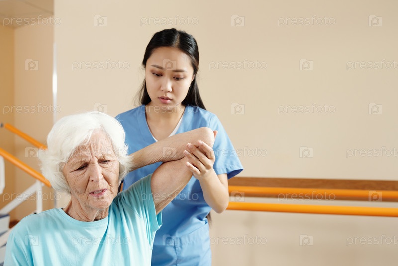 Физиотерапевт помогает пожилой женщине выполнять физические упражнения